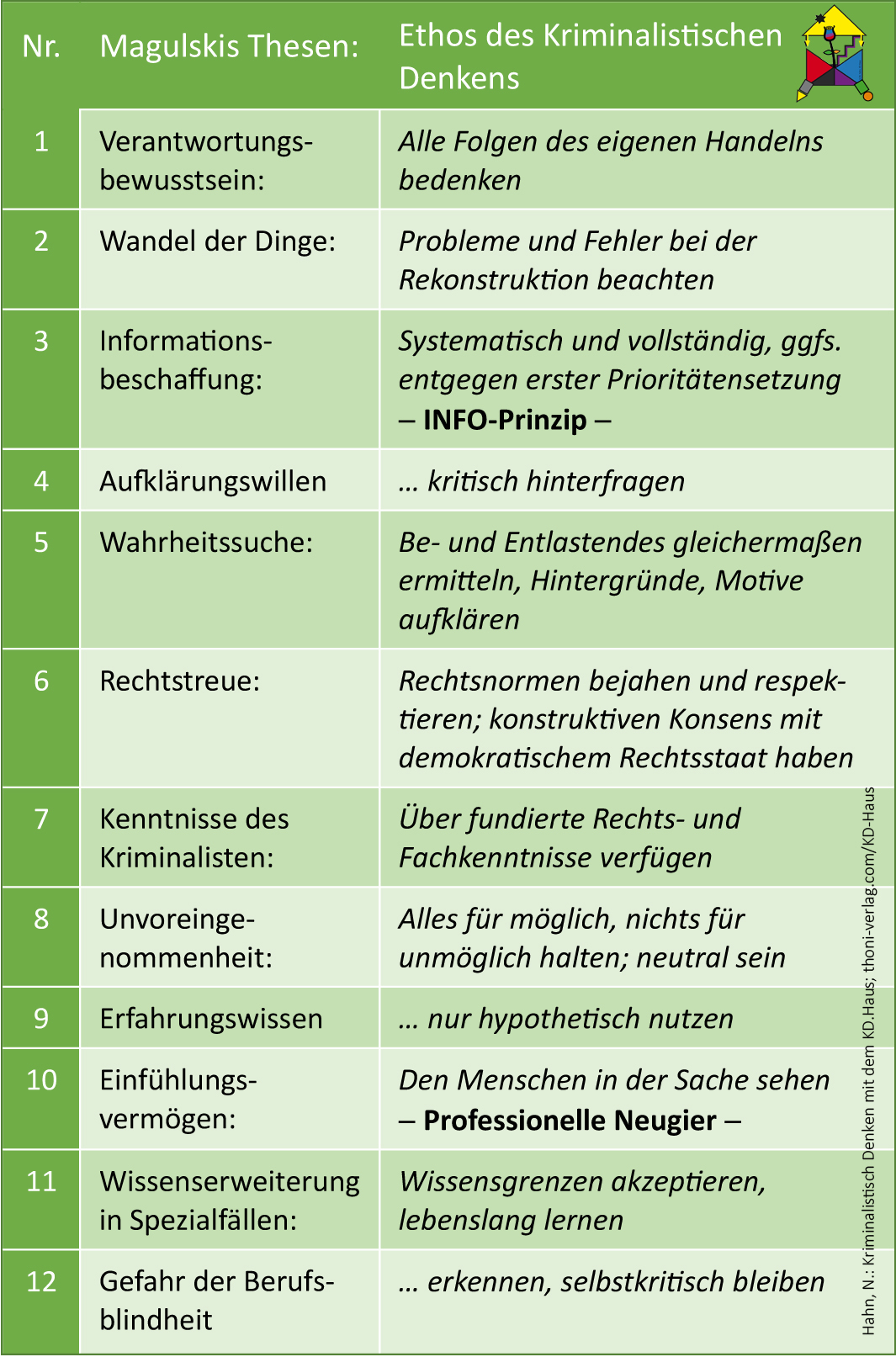 Rainer Magulski stellte 1982 zwölf Leitgedanken zum Kriminalistischen Denken auf, die bis heute aktuell sind. In der Tabelle "Magulskis Thesen" werden sie in Teil V zusammengefasst und dem Ethos des Kriminalistischen Denkens gegenübergestellt (Kriminalistik 8–9/24, Pkt. 5.2, Abb. 9)