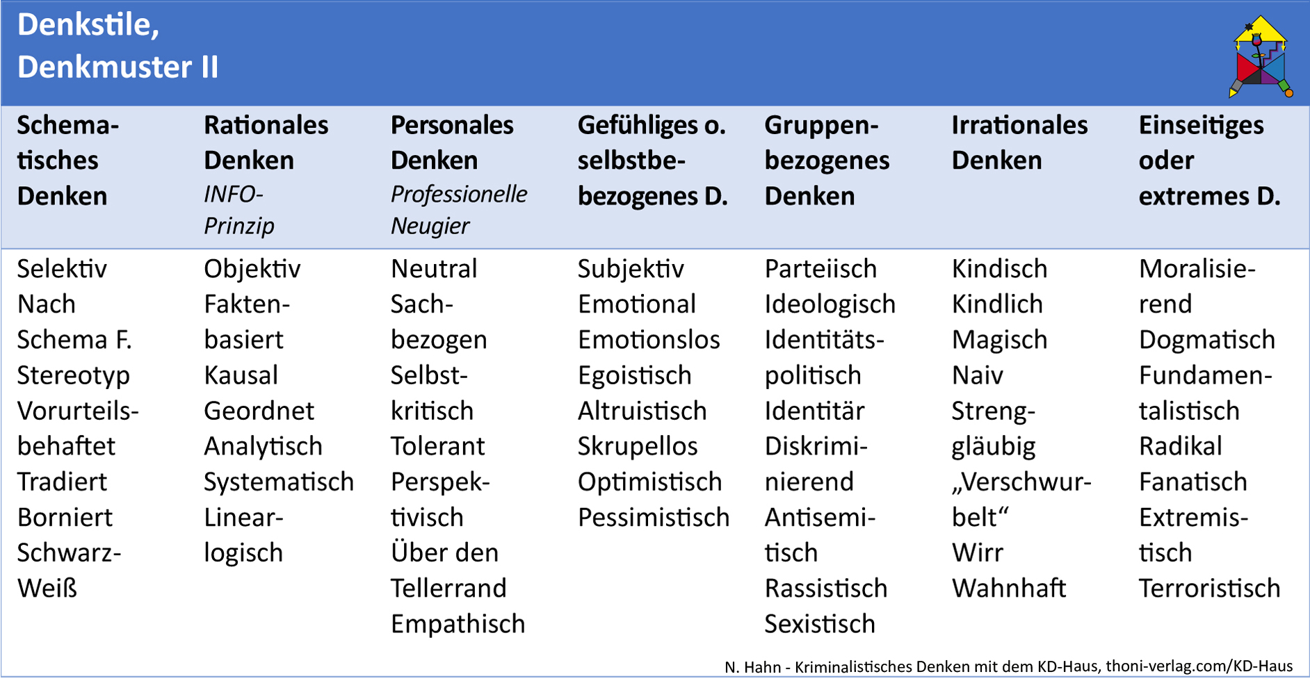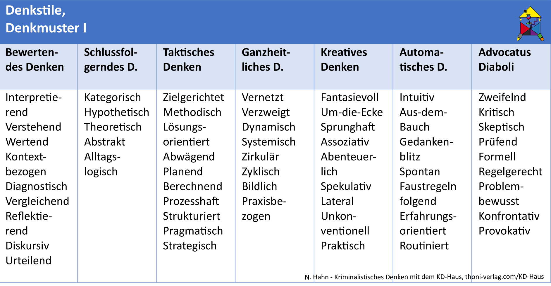 Im vierten Teil setzt Nikola Hahn das Farbkonzept im KD-Haus in Beziehung zum "Werkzeugkoffer Vernehmung" und adaptiert das "Sechs-Hüte-Denken" ("Six Thinking Hats") von de Bono in ihr Modell (Kriminalistik 7/24, Pkt. 4).